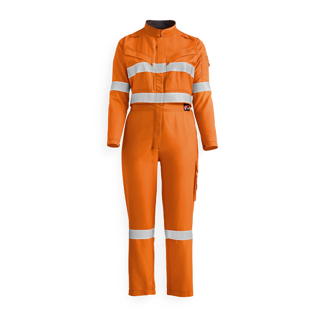 Deluxe women's coverall features many sizes for a great fit. It features press studs covered by fabric on the inside, so nothing but soft protective material comes in contact with your skin. Two-way horizontal zippers offer convenient opening at the waist. Major seams are double- or triple-stitched and stress points are bar-tacked for strength. 2" Reflective FR striping applied to arms, legs, and around the body added for better visibility and safety. |
